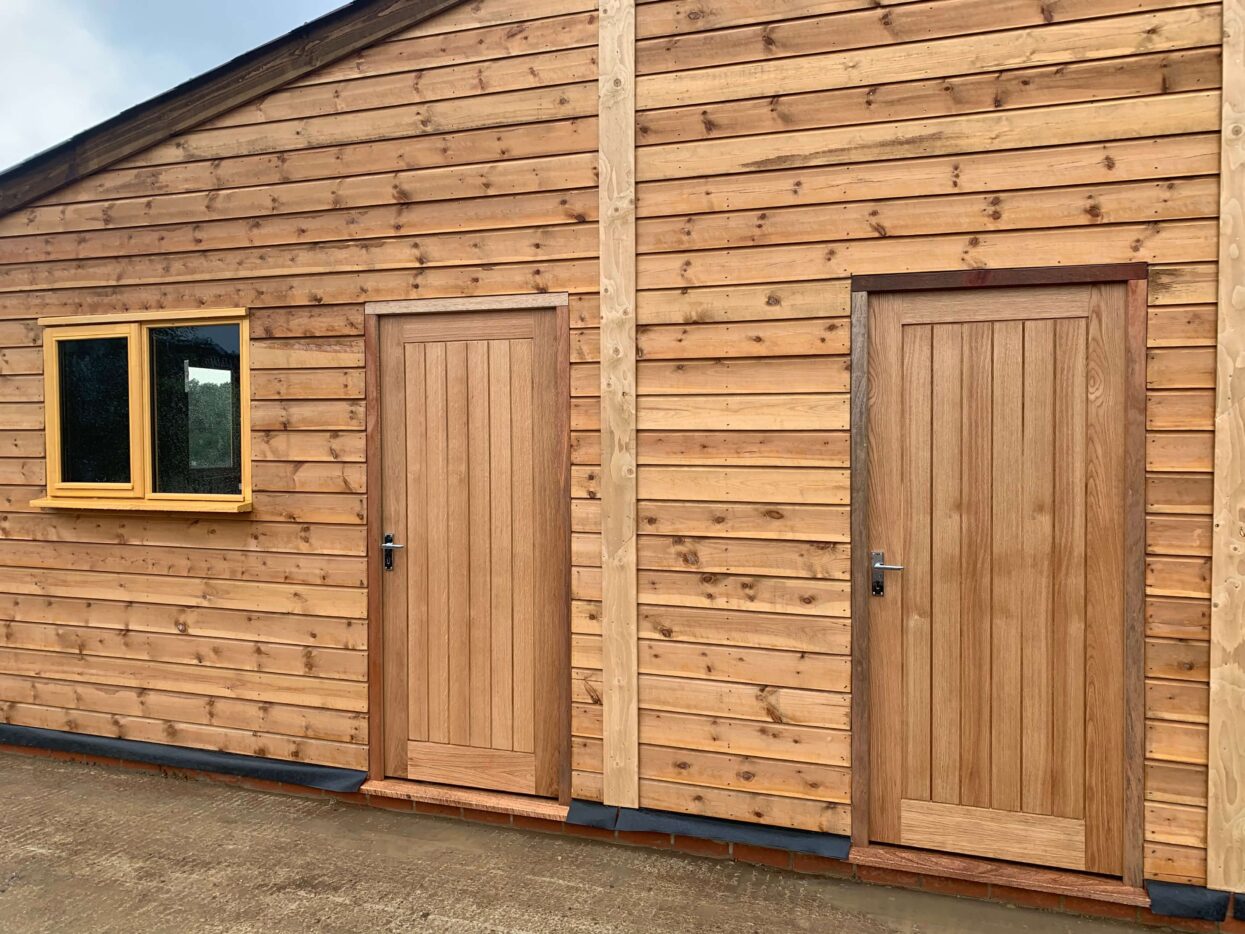 Bottom stable doors, manufactured from 125mm x 25mm tongue, groove & v-jointed timber, ledged and braced. Lined with exterior grade plywood.